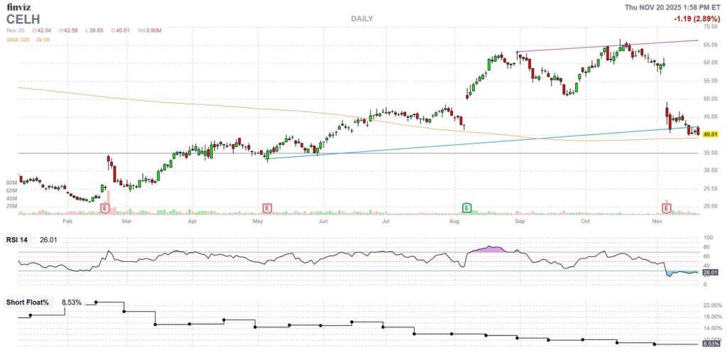 Subsequent pump fake rallies have likely frustrated investors who thought that was time to ‘buy the dip.’ With the macro headwinds classified as short-term, the time may finally be now; this extended slide has CELH testing a historically bullish trendline.
